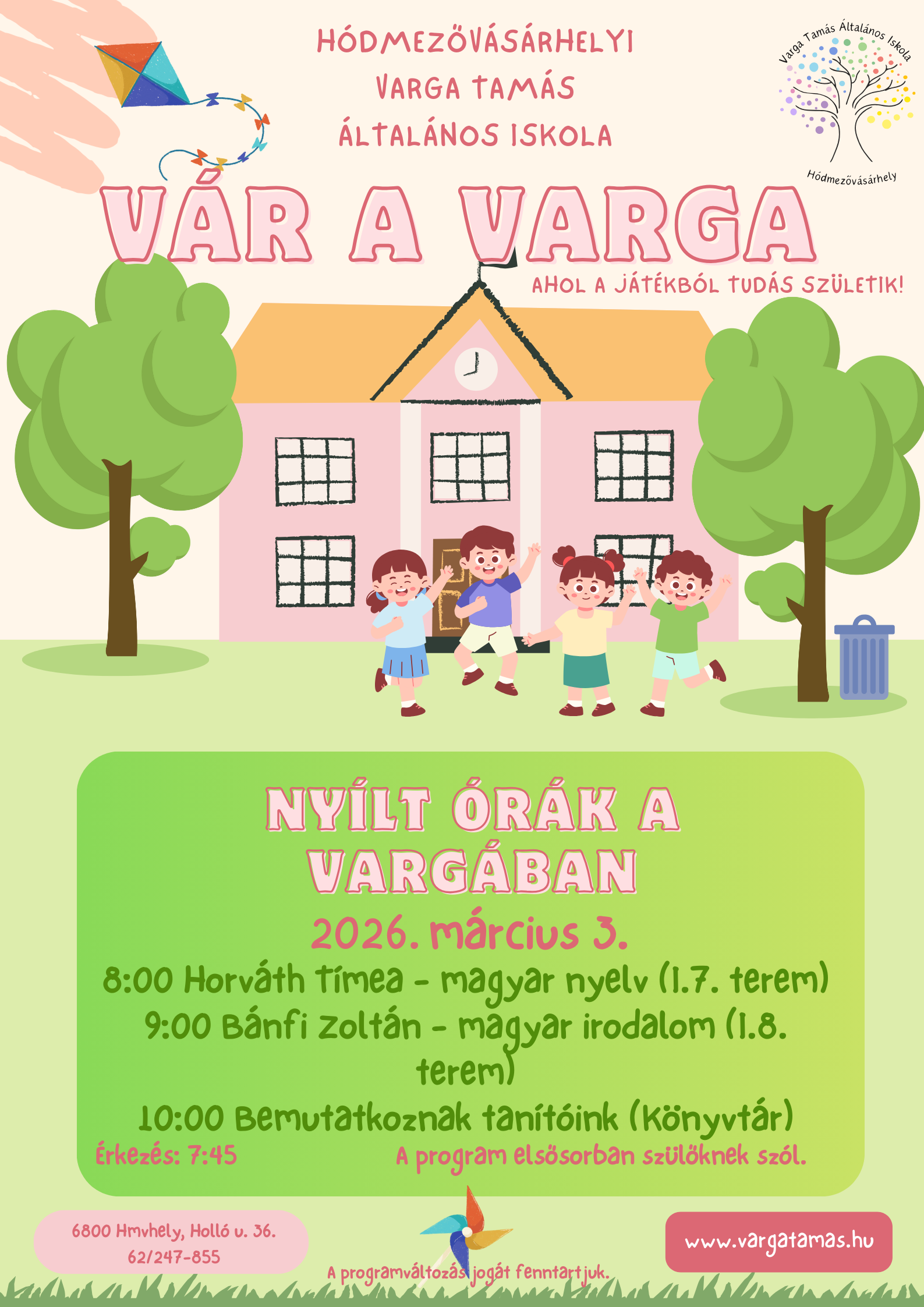 Szeretettel köszöntjük Önt a Hódmezővásárhelyi Varga Tamás Általános Iskola honlapján.