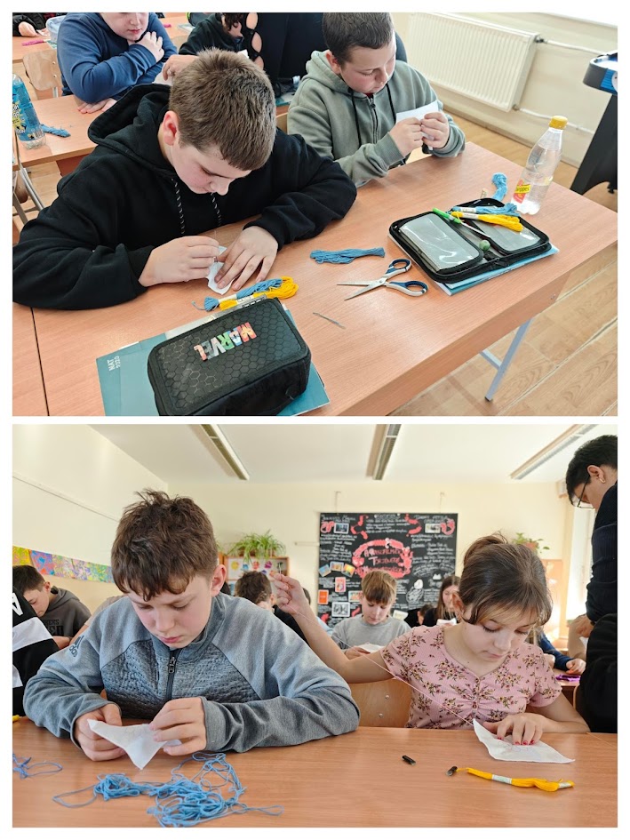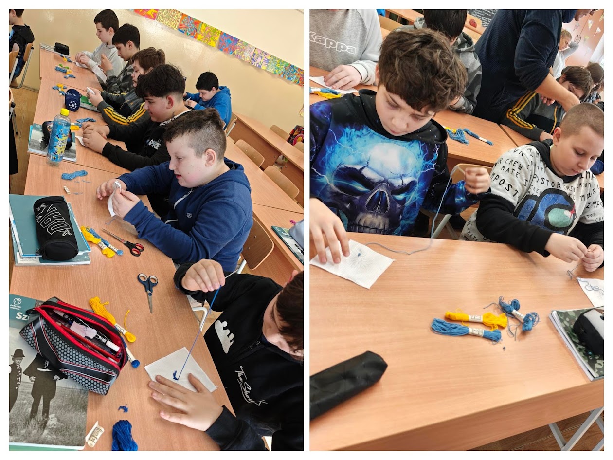 Hon- és népismeret órán a hatodikosok a népi textíliák díszítését gyakorolták. Némi idegenkedés után nagy igyekezettel próbálkoztak a kalocsai hímzés alapjainak elsajátításával.