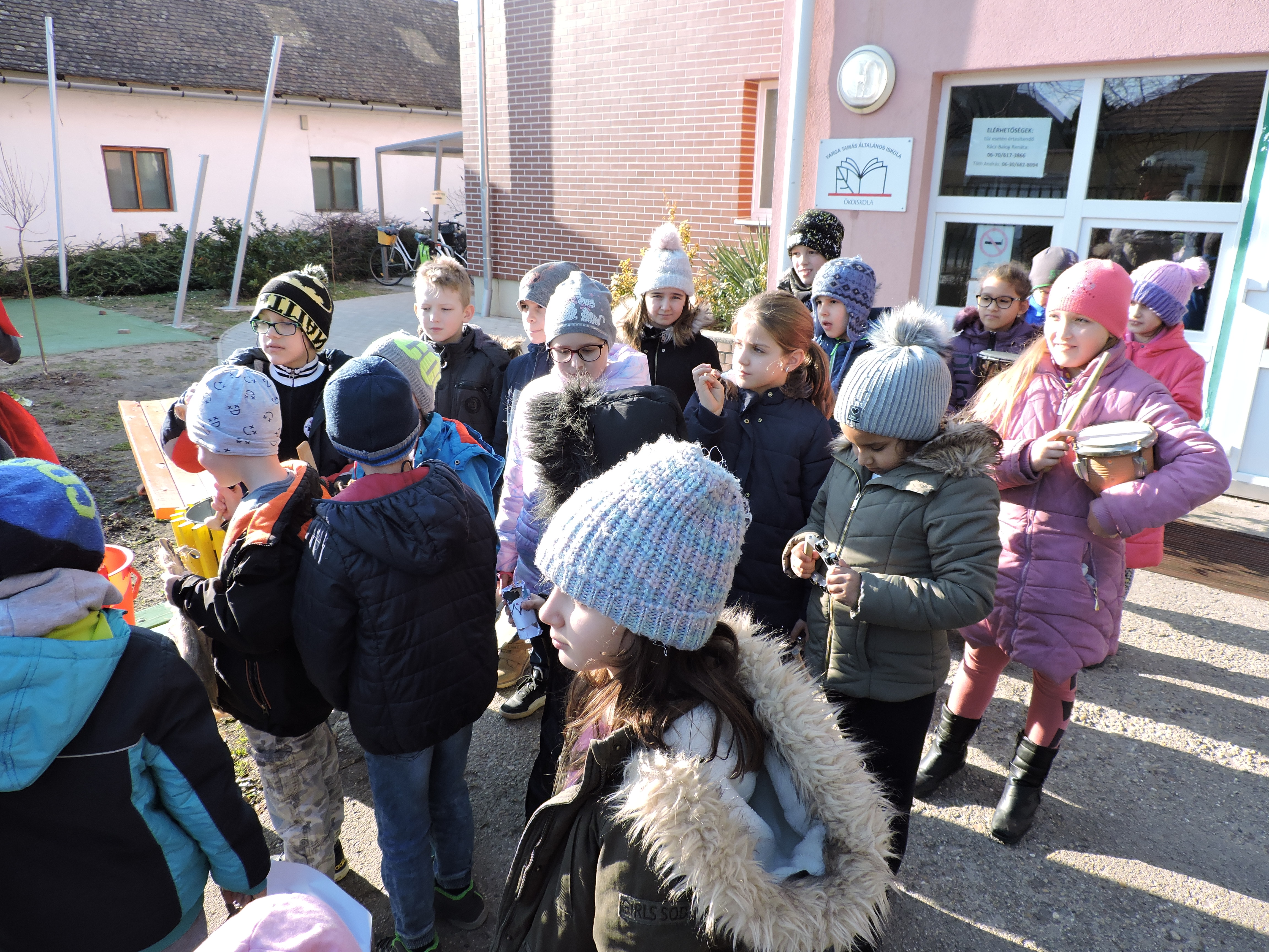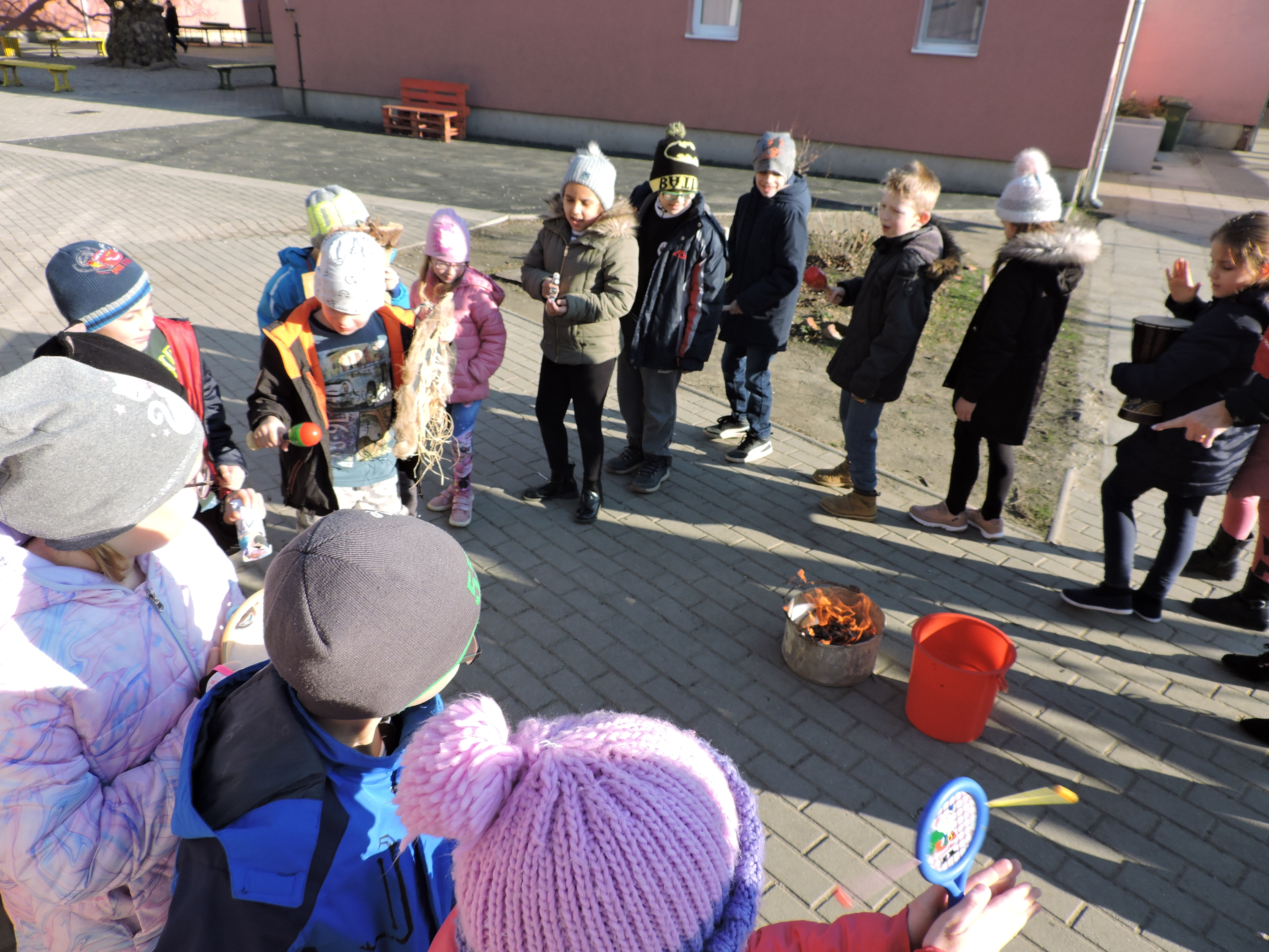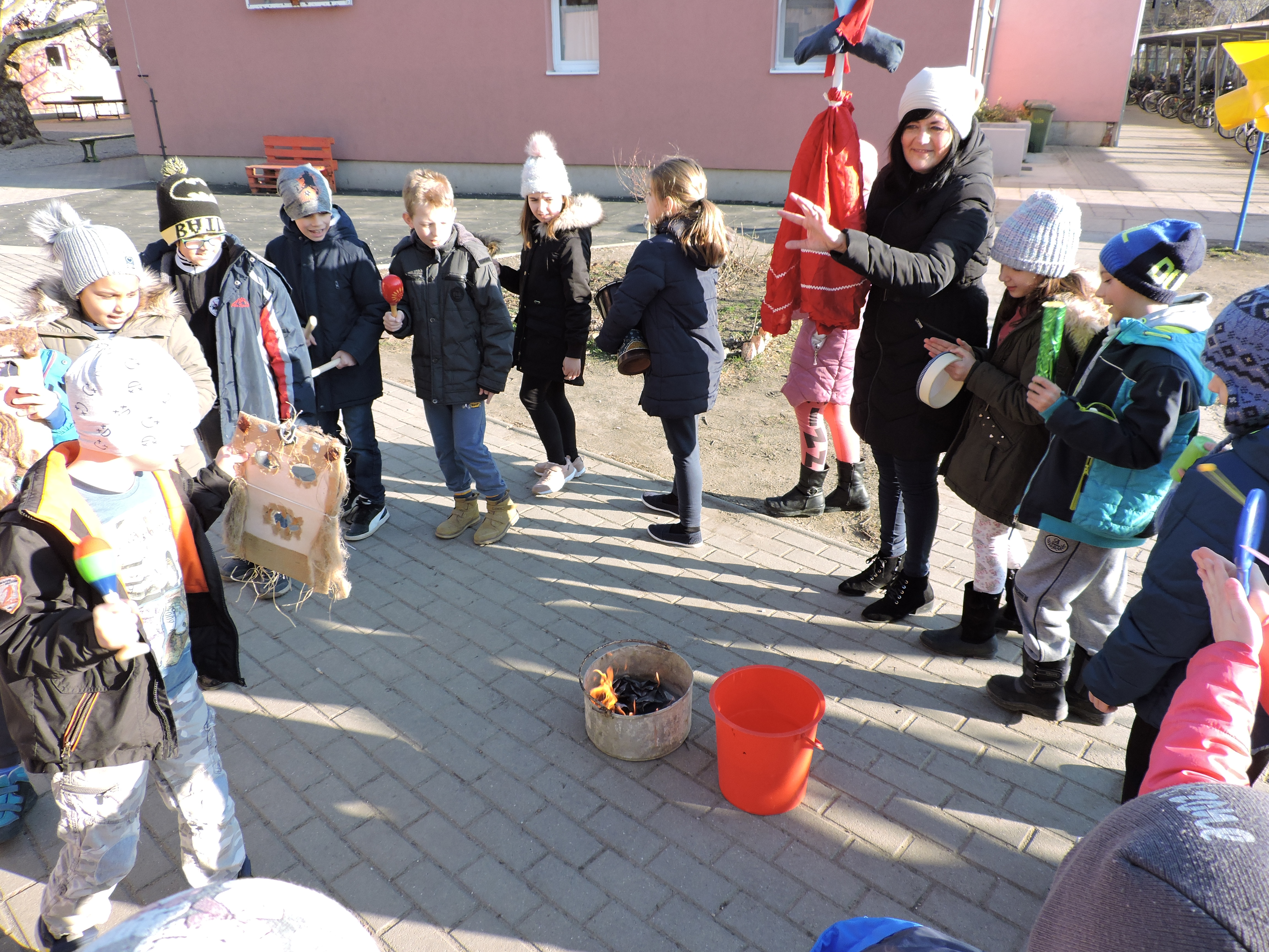 Az Ökoszakkörösök rigmusok és ritmushangszerek megszólaltatásával körbejárták az iskolát. A kiszebáb elégetésével kisöpörték a telet.