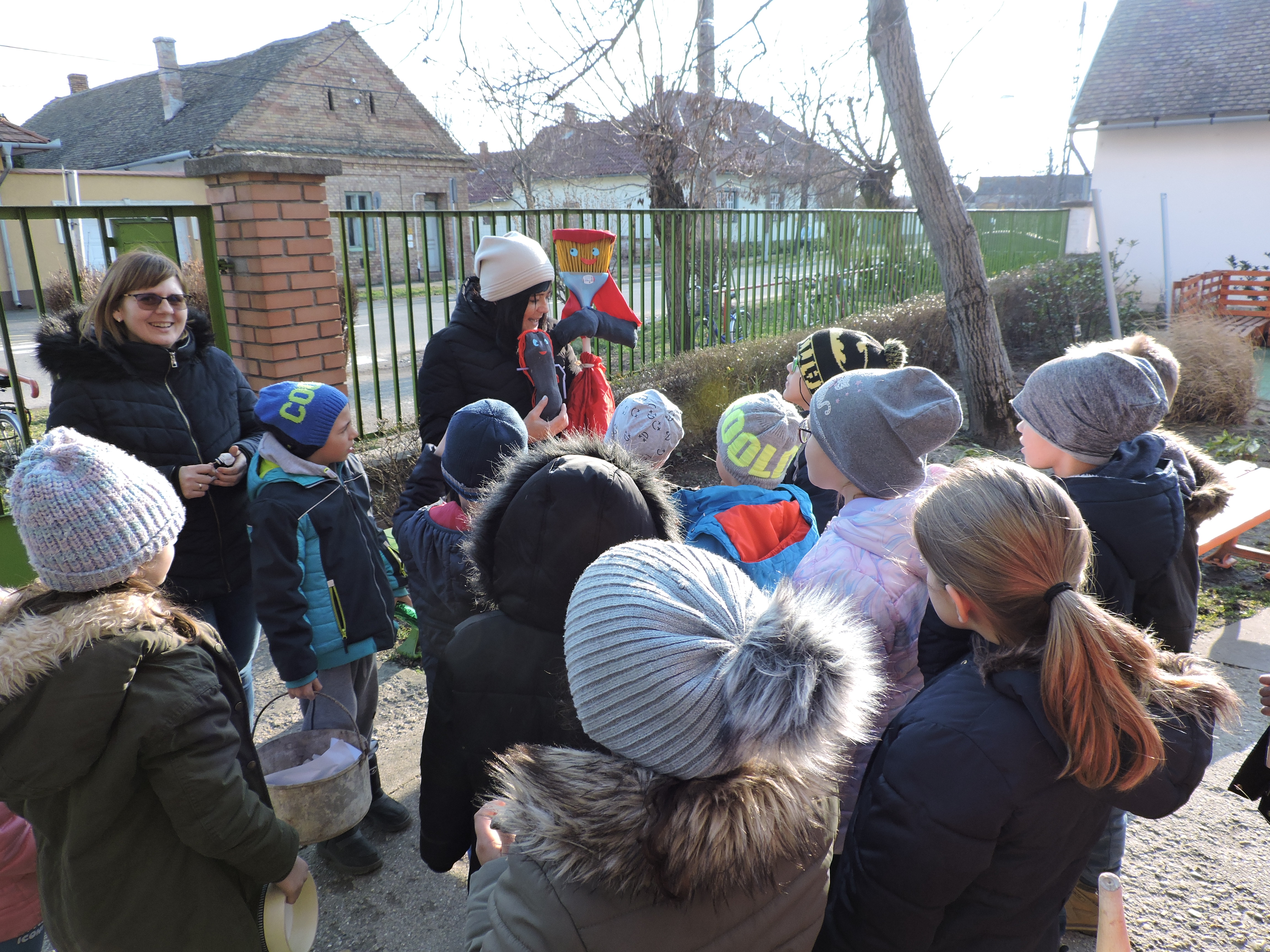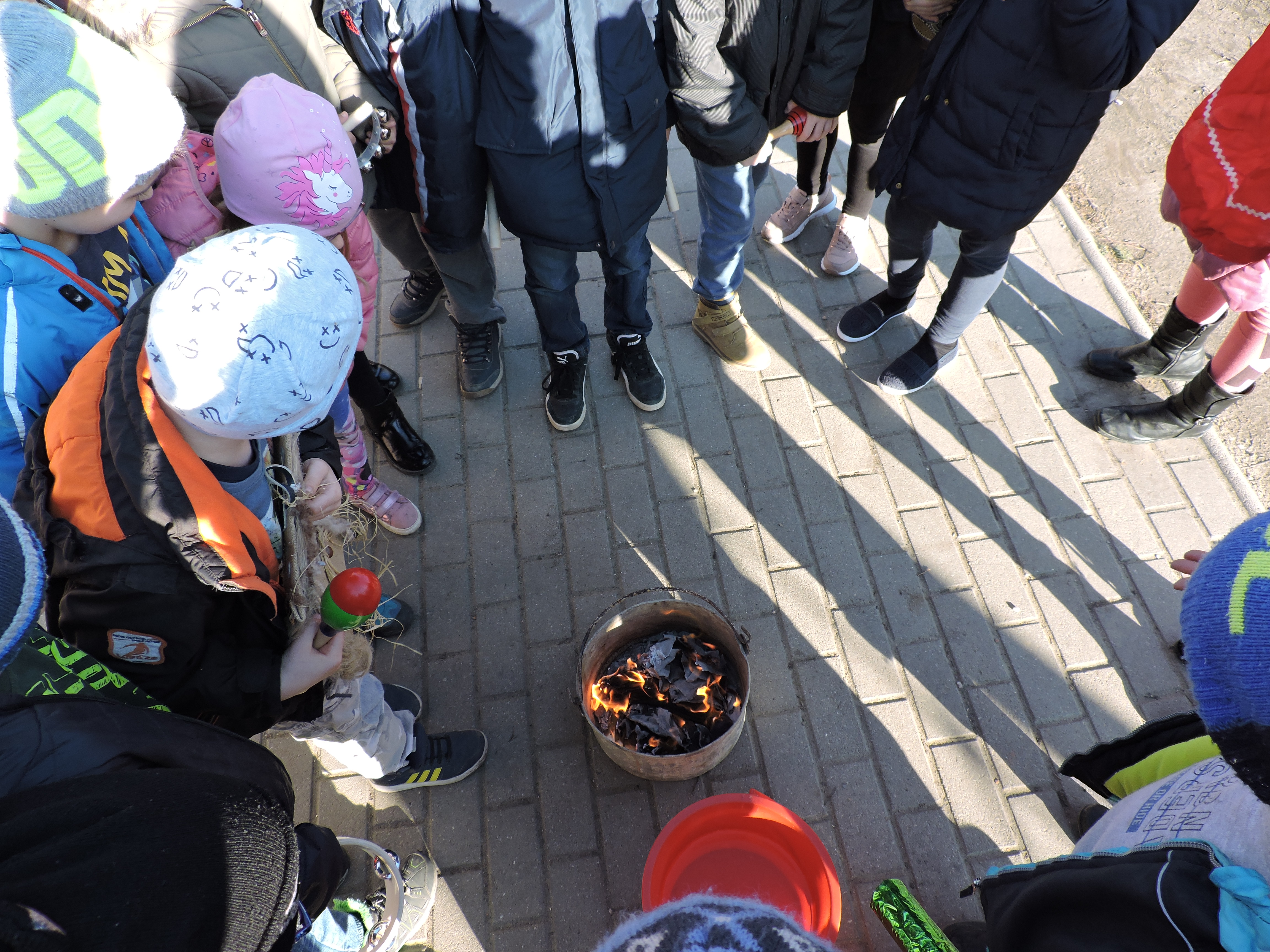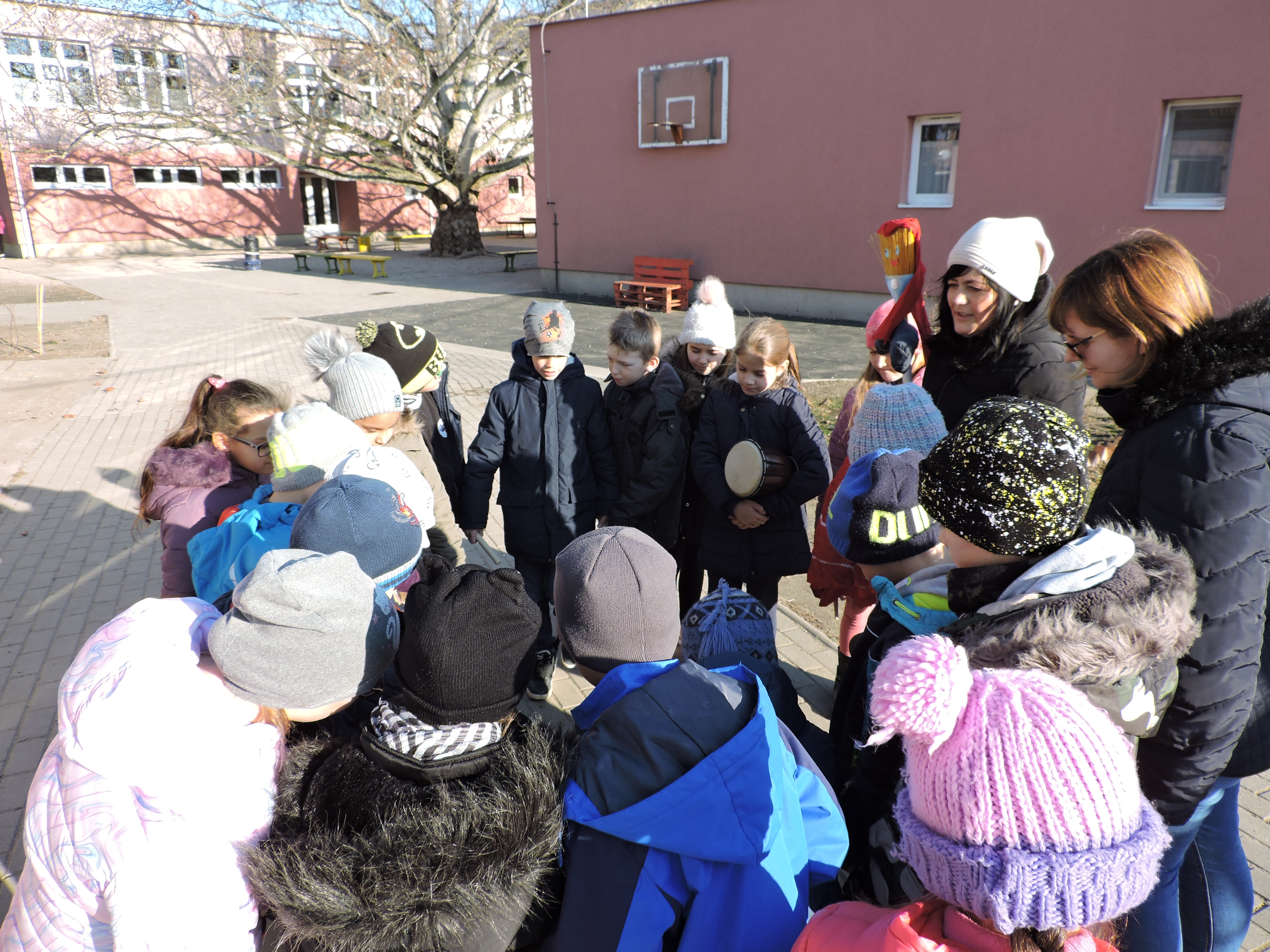 Az Ökoszakkörösök rigmusok és ritmushangszerek megszólaltatásával körbejárták az iskolát. A kiszebáb elégetésével kisöpörték a telet.