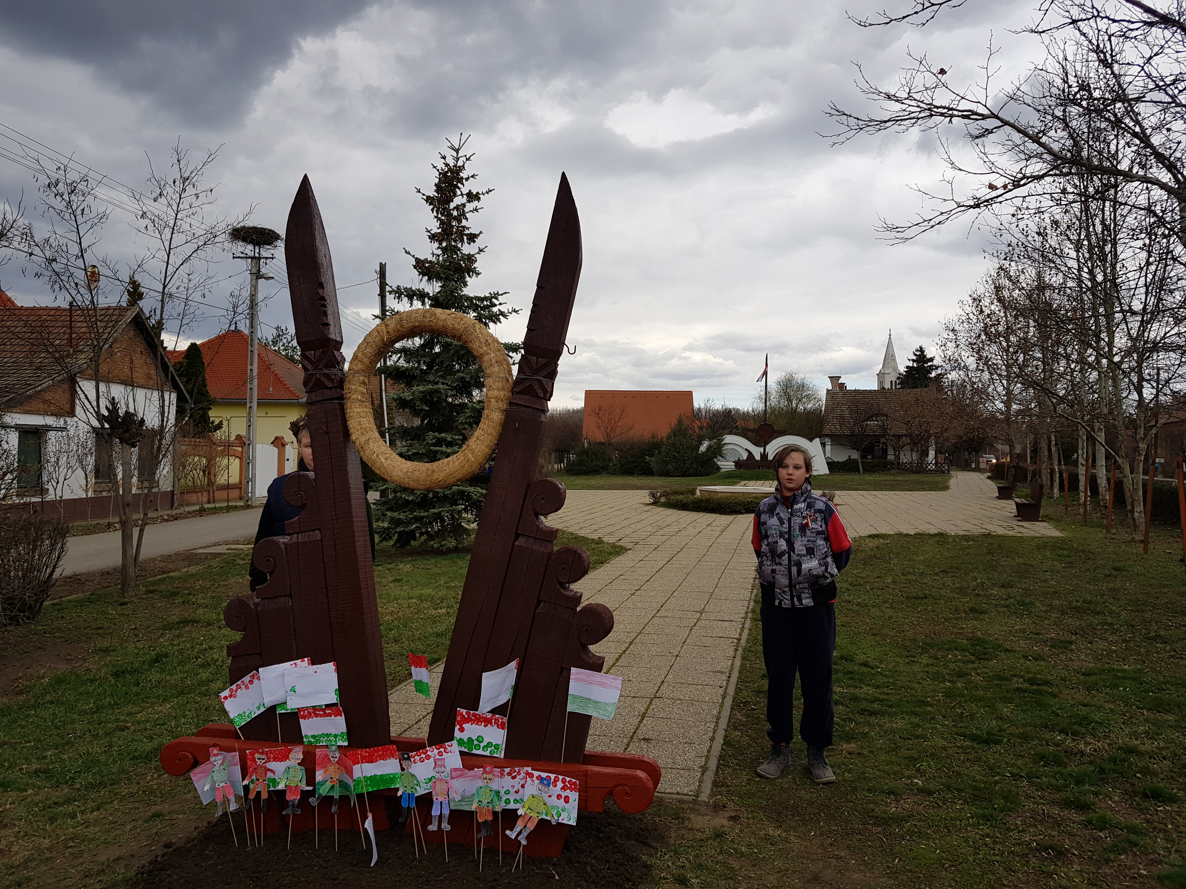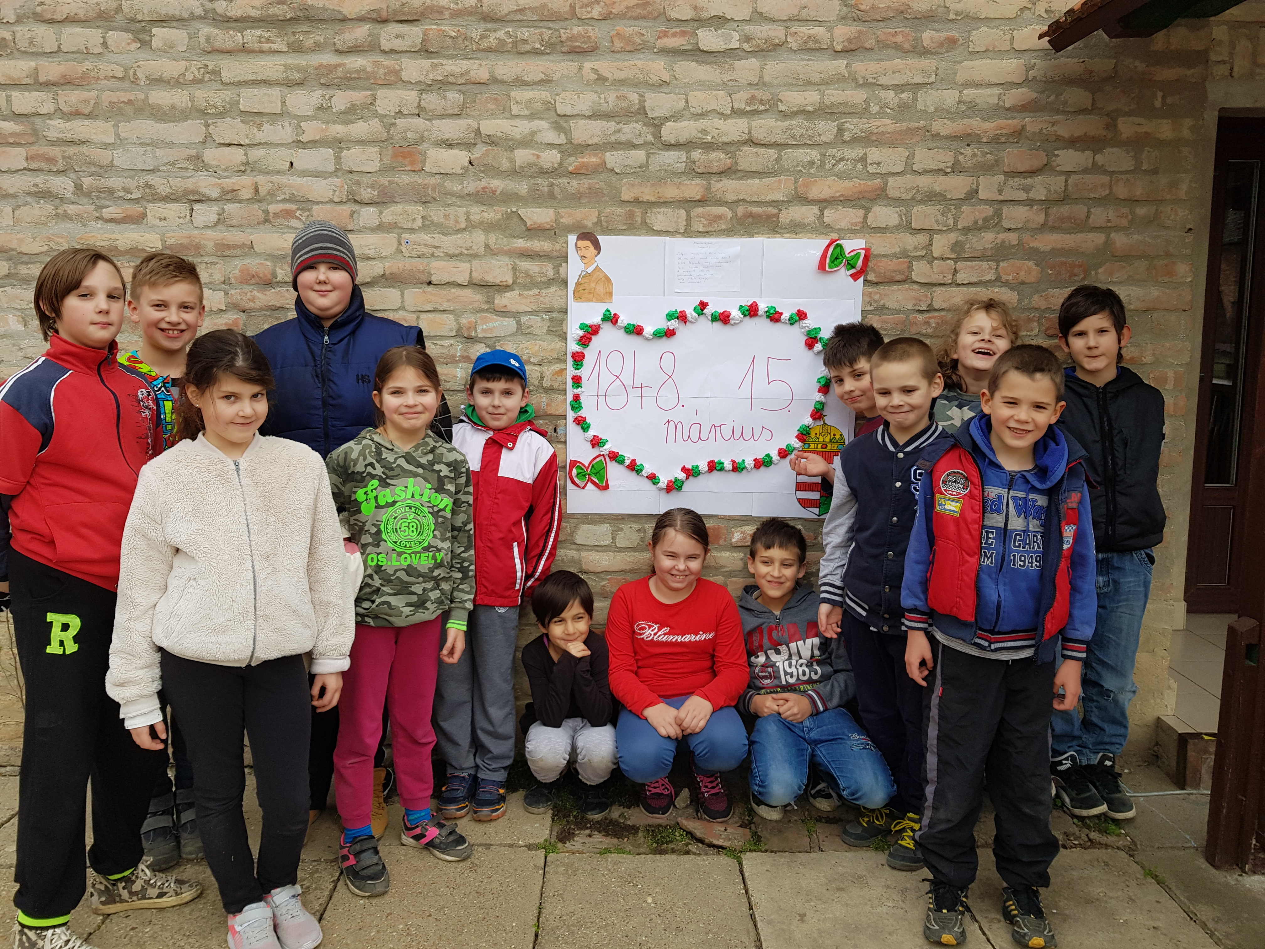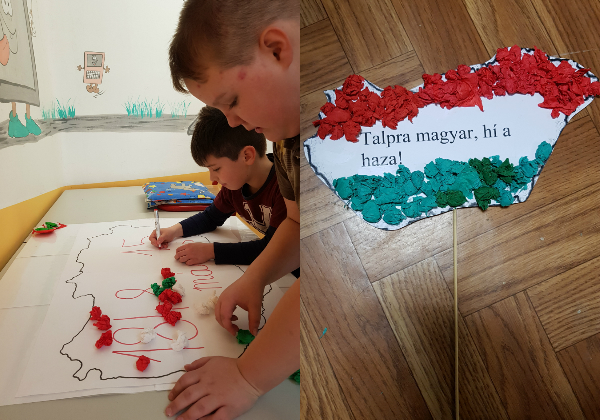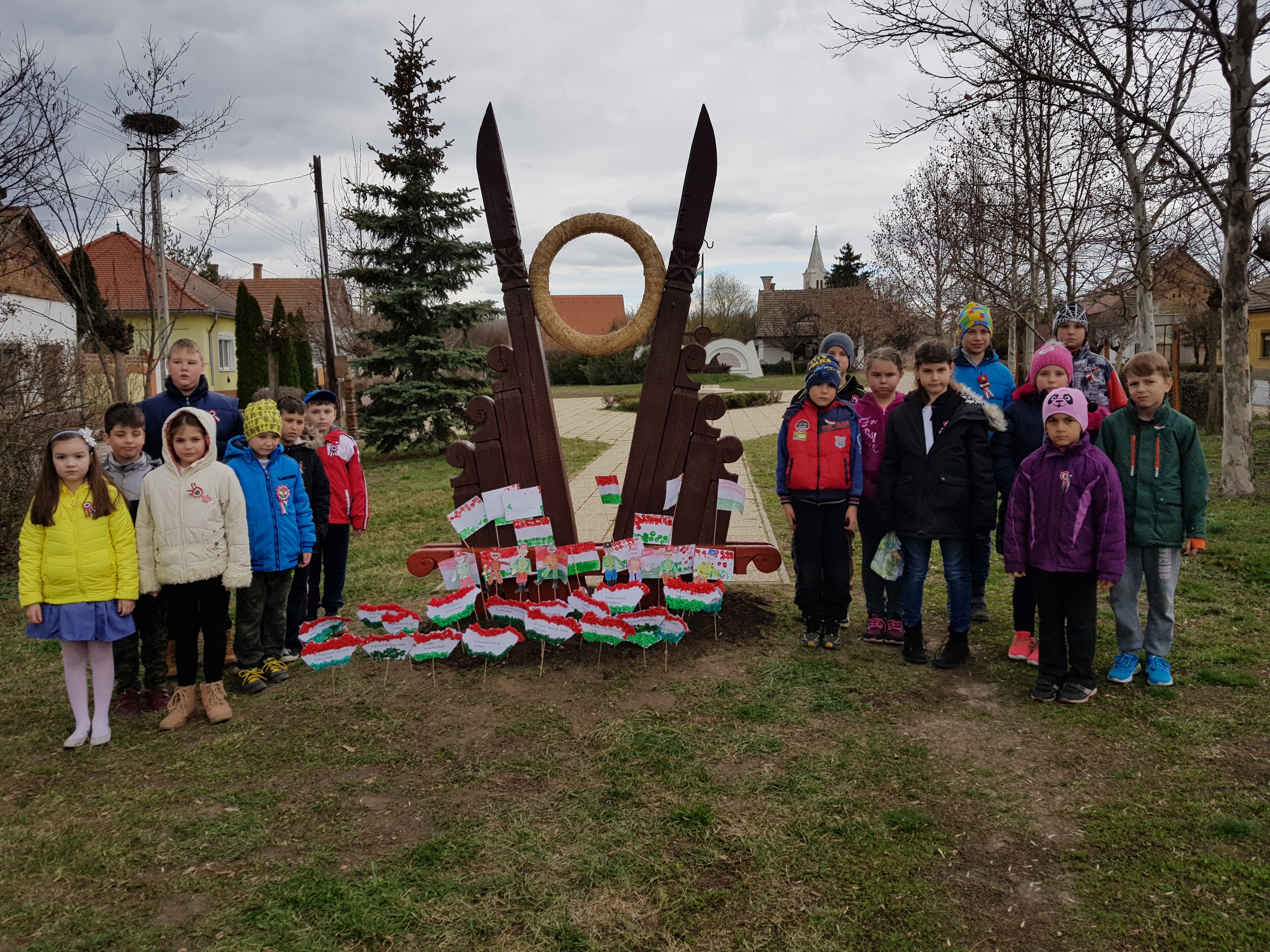 A Nemzeti ünnep tiszteletére zászlókat, fali dekorációt készítettünk a gyerekekkel közösen. A Főtéren talalható emlékműnél megemlékeztünk, elszavaltuk a Nemzeti dalt és elhelyeztük a zászlókat.