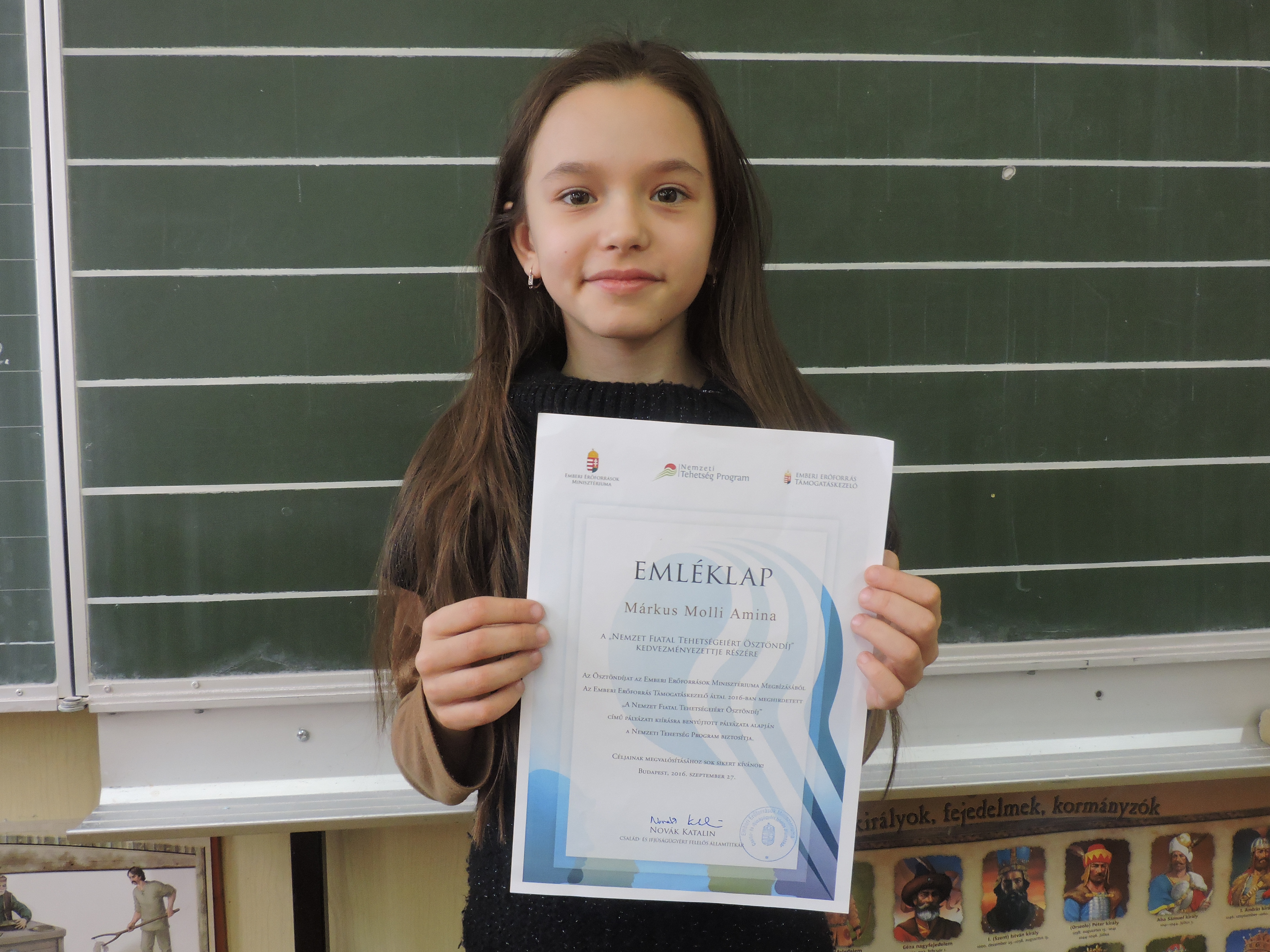 Márkus Molli 4.a osztályos tanuló megkapta a Nemzet Fiatal Tehetségeiért Ösztöndíjat, melyet Budapesten az Emberi Erőforrások Minisztériumában vehetett át.