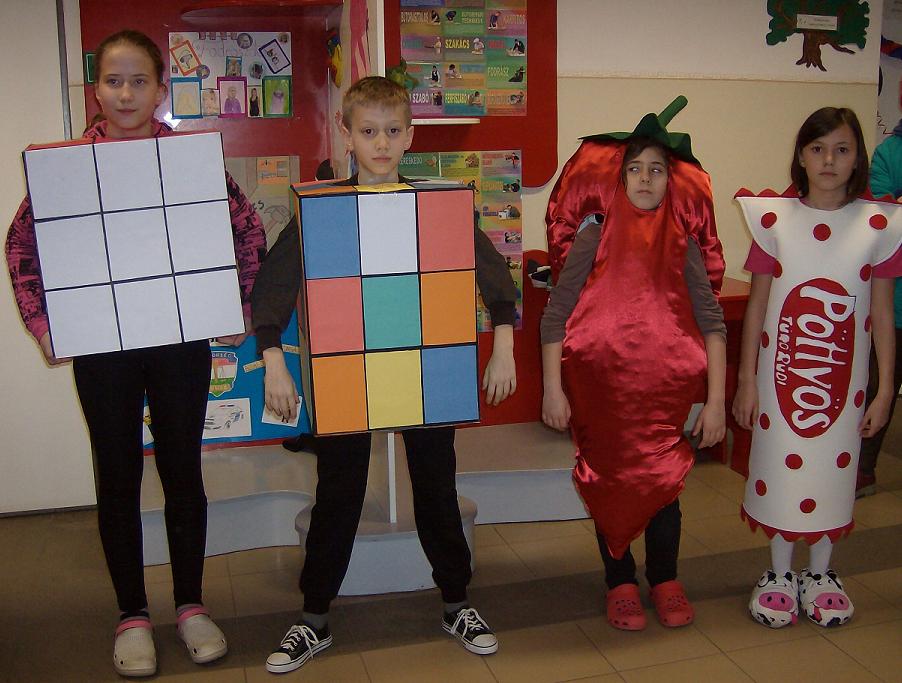 Iskolánkban február 21-én pénteken zajlott a farsangi jelmezverseny, a tornateremben a drukkoló szülők tömege előtt vonultak fel a jelmezesek, melyen ötletességből nem volt hiány.Találkozhattunk pattogatott kukoricával, Túró Rudival,mézeskaláccsal, és szőlőnek öltözött kisdiákkal is a farsangi rendezvényen.