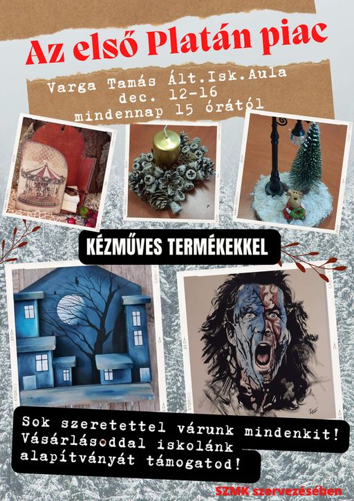 A szülői munkaközösség szervezésében december 12 és 16 között 15 órától megnyitjuk iskolánk aulájában az első Platán piacot. Nyitott az iskola ajtaja, az auláig be lehet jönni!